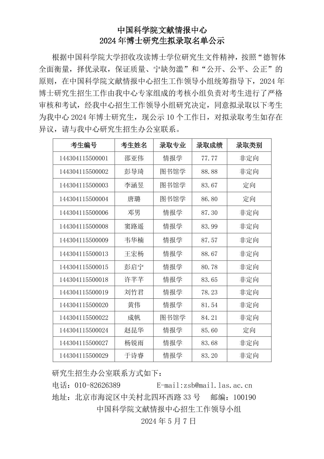 中国科学院文献情报中心2024年博士生拟录取名单公示